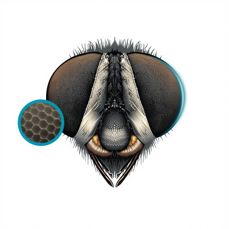 1OmmatidiaEach compound eye contains thousands of tiny lenses. Each captures part of the visual field, together forming a mosaic image.